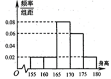 某学校组织500名学生体检,按身高(单位:cm)分组:第1组[155,160),第2组[160,165),第3组[165,170),第4组[170,175),第5组[175,180],得到的频率分布直方图如图所示。