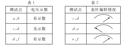 由表1可知,电压表接a、b,电压表有示数,说明a、b两点与电源间无断路;电压表接c、d,电压表无示数,说明c、d两点与电源间存在断路;电压表接d、f,电压表有示数,说明d、f两点与电源两极间无断路,综合以上分析可知,电路故障出现在d、f间,故D正确,ABC错误;