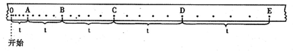 在“测定匀变速直线运动的加速度”的实验中,某同学在打出的如图所示的纸带上按打点的先后顺序,每隔一定的点共选取了O、A、B、C、D、E六个计数点.现用剪刀从它们的分界点将纸带剪开,得到五段纸带,将这五段纸带按从短到长的顺序但不重叠地贴在坐标系中,如图所