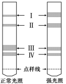 2.为研究高光强对移栽幼苗光合色素的影响,某同学用乙醇提取叶绿体色素,用石油醚进行纸层析,右图为滤纸层析的结果(Ⅰ、Ⅱ、Ⅲ、Ⅳ为色素条带)。下列叙述正确的是