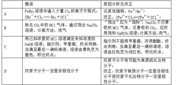 对酸碱指示剂的变色范围模糊不清,氧化性的强弱与还原性强弱的判断失误,以及审题不仔细,导致过量与少量的辩证关系在化学反应中的应用,双原子分子与多原子分子组成的分子中的极性与非极性的判断失误
