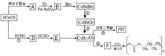 乙炔与甲醛发生加成反应生成D为HC≡CCH2OH,D与甲醛进一步发生加成反应生成E为HOCH2C≡CCH2OH,E与氢气发生加成反应生成HOCH2CH2CH2CH2OH,2分子乙炔聚合得到A为HC≡CCH=CH2,结合信息可知及HOCH2CH2CH2CH2OH可知,A与氢气发生加成反应生成B为CH2=CHCH=CH2,B与溴发生加成反应生成BrCH2CH=CHCH2Br,BrCH2CH=CHCH2Br与氢气发生加成反应生成BrCH2CH2CH2CH2Br,BrCH2CH2CH2CH2Br发生水解反应得到HOCH2CH2CH2CH2OH,1,4﹣丁二醇与对苯二甲酸发生缩聚反应生成PBT为