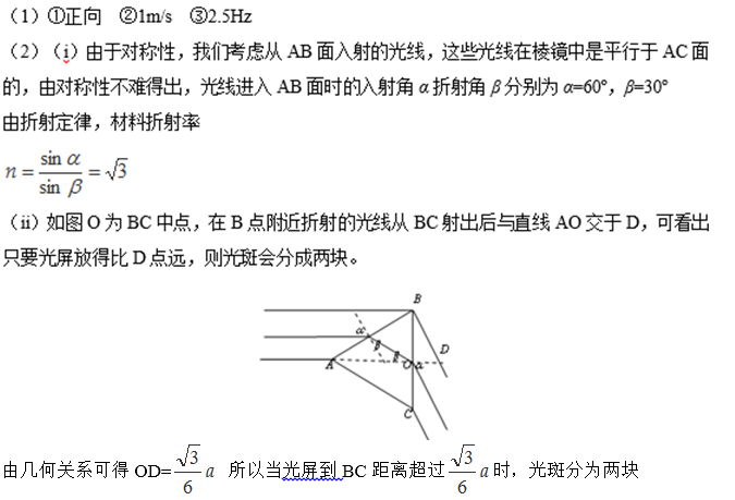 ②作出三棱镜内完整的光路图,指出最终的出射光线与最初的入 射光线之间的夹角。