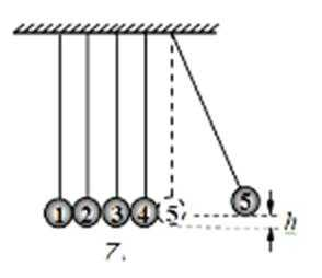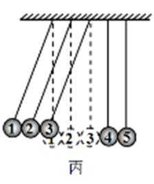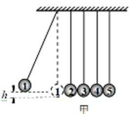 下图是“牛顿摆”装置,5个完全相同的小钢球用轻绳悬挂在水平支架上,5根轻绳互相平行,5个钢球彼此紧密排列,球心等高。用1、2、3、4、5分别标记5个小钢球。当把小球1向左拉起一定高度,如图甲所示,然后由静止释放,在极短时间内经过小球间的相互碰撞,可观察到球5向右摆起,且达到的最大高度与球1的释放高度相同,如图乙所示。关于此实验,下列说法中正确的是