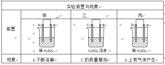 由A、B、C、D四种金属按表中装置进行实验,下列叙述中正确的