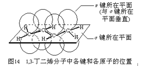 异戊二烯分子中的碳碳双键为共轭键,即4个碳原子间的两个碳碳双键,其实是除σ键之外的,另一个大π键(4中心4电子)(如下图示),碳碳之间因共轭π键而不能旋转,一个1,3-丁二烯分子最少有10个原子共平面,则一个异戊二烯分子中最多有11个原子共平面.这是因为甲基还可以通过单键旋转而使一个甲基H共面。
