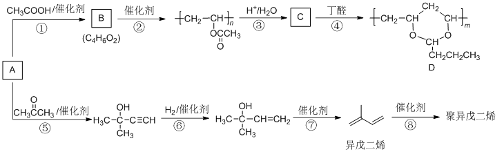由基本有机化工原料A(C2H2)制备有机物D和聚异戊二烯的合成路线如下图所示: