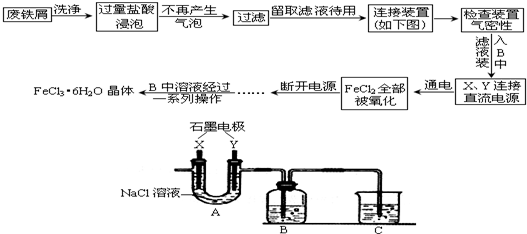 解:为了制备FeCl3•6H2O,因此必须在Y电极产生氯气,将B中的氯化亚铁氧化,所以X电极连接电源负极,A中发生的反应为2Cl-+2H2OCl2+H2+2OH-,B中亚铁离子被氧化为铁离子;在实验中,多余的氯气肯定会通过导管排出,而氯气有毒,所以必须进行尾气处理,故C中盛放NaOH溶液;