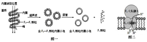 线粒体是有氧呼吸的主要场所,科学家在研究线粒体组分时,首先将线粒体放在低渗溶液中获得涨破的外膜,经使用一定方法后将外膜与线粒体内膜包裹的基质分开。再用超声波破坏线粒体内膜,破裂的内膜自动闭合成小泡,然后用尿素处理这些小泡,实验结果如图一所示。图二为内膜与F0-F1颗粒物局部结构图。请分析并回答下面的问题。