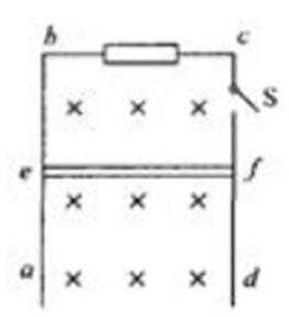 设导轨间距为l,则闭合开关后ef做切割磁感线运动的速度为v时产生的感应电动势大小为E=Blv,感应电流I的方向由右手定则可知为e→f,受到的安培力