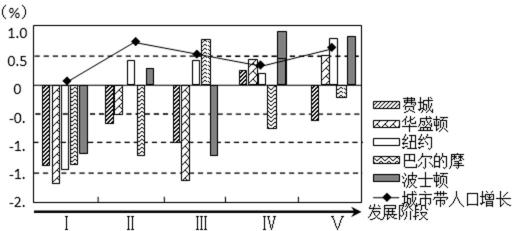 9.美国东北部大城市带(亦称波士华城市带)是世界上形成最早、发育最为成熟的大城市带。下图为“1970—2008年波士华城市带五个大城市中心城区人口增长率变化和城市带人口增长率曲线示意图”。