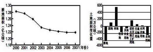 23.下图为2000年-2007年我国耕地面积变化图,图13为2002年-2007年我国各类土地面积变化情况示意图。