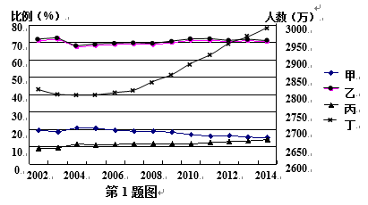 我国实行计划生育政策,青少年出生率降低,曲线甲;老年人口比例增加,曲线丙;总人口不断增加,曲线乙,青壮年比例变化不大,曲线丁,故答案显选C。