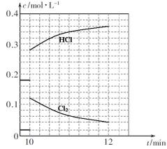和l mol HCl,12 min时达到新平衡。在图2中画出10-12 min,Cl2和HC1的浓度变化