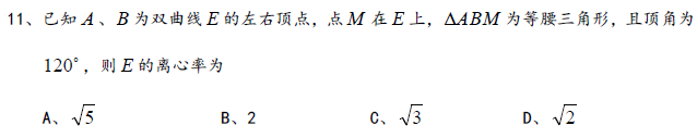 4.已知A,B为双曲线E的左,右顶点,点M在E上,△ABM为等腰三角形,顶角为120°,则E离心率为( )