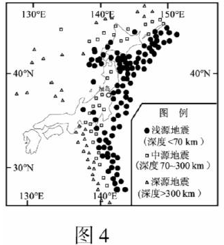 10. 图4为日本及其附近海域震源深度分布示意图。