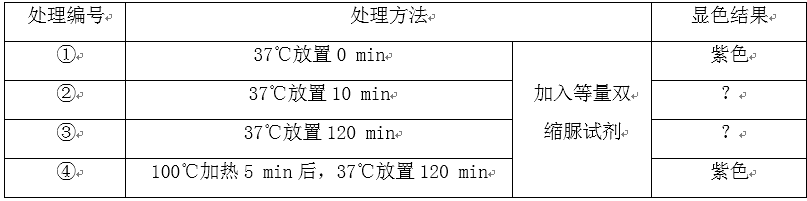 (2)1)双缩脲试剂A为NaOH溶液,加入该试剂后样液的颜色不变;处理④中100℃加热的目的是破坏蛋白酶的活性;酶的活性与温度有关,在高温时酶变性失去活性,在适宜温度下,蛋白酶催化蛋白质分解,作用时间越长蛋白质含量越少,用双缩脲试剂检测后颜色越浅。2)氨基酸通过氨基转换作用(或转氨基作用)可以形成新的氨基酸,由氨基酸通过脱氨基作用形成的不含氮部分可以转化为糖类和脂肪。