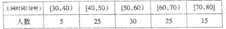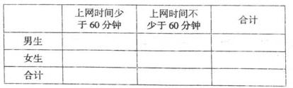解析:(1)由男生上网时间频数分布表可知100名男生中,上网时间少于60分钟的有60人,不少于60分钟的有40人,………………2分