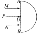 (2)一半圆形玻璃砖,玻璃的折射率为,AB为其直径,长度为D, O为圆心,一束宽度恰等于玻璃砖半径的单色平行光束垂直于AB从空气射入玻璃砖,其中心光线P通过O点,如图所示.M、N为光束边界光线.求:M、N射出玻璃砖后的相交点距O的距离。