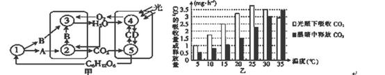 (2)从乙图中可以看出,光合作用速率最大时的温度为( )。在15 ℃时,光合作用速率为呼吸作用速率的( ) 倍。假设每天光照12小时,最有利于植物生长的温度是( )。分析图中柱状图变化,可看出光合作用和呼吸作用的酶所需要的( ) 不同。