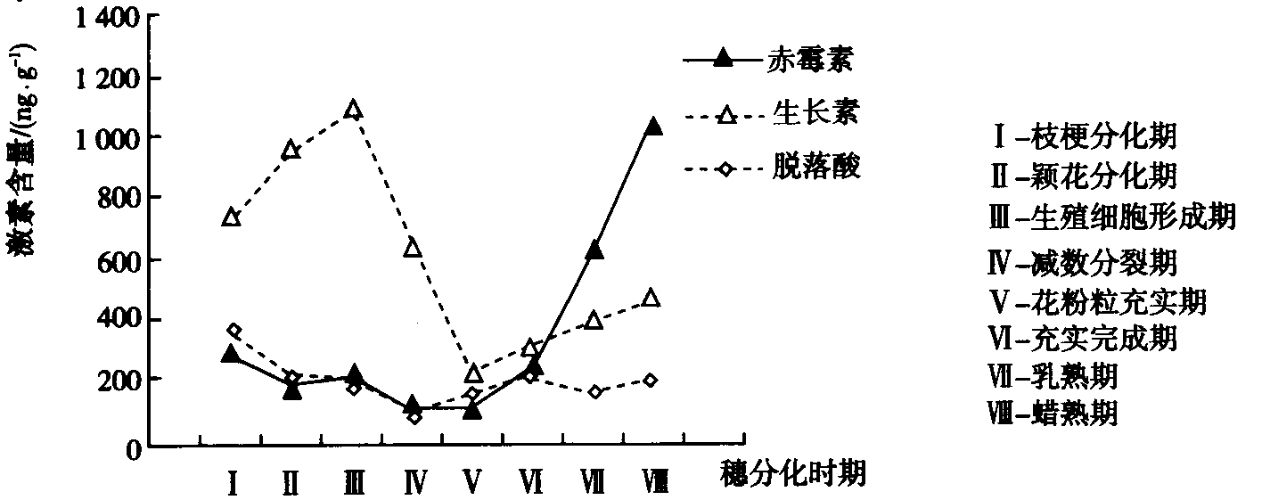 科学家为研究激素水平与水稻穗、粒发育的关系,将水稻幼穗分化及灌浆过程划分为不同阶段,测定了水稻穗分化过程中内源激素含量的动态变化,测定结果如下图。下列叙述不正确的是( )