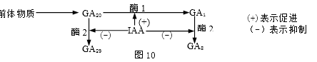 28.图10为生长素(IAA)对豌豆幼苗茎内赤霉素生物合成影响的示意图。图中 GA1、GA8、GA20、GA29 是四种不同的赤霉素,只有 GA1 能促进豌豆茎的伸长。若图中酶 1 或酶 2 的基因发生突变,会导致相应的生化反应受阻。
