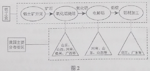 电解铝业是高耗能、高污染产业。近年来,我国新建电解铝产能主要分布在西北地区。有人认为,我国电解铝业西移大势所趋。图2示意铝工业主要部门及其在我国的主要分布省区(2010年前)。据此完成3~5题。