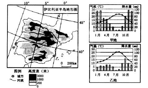 23.读伊比利亚半岛地形图及气候资料图,关于图中甲.乙两地气候特征及其成因的叙述,正确的是( )
