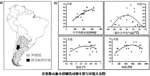 6.读安第斯山脉中段30°S-35°S(阿根廷)哺乳动物丰度与环境关系图,据图判断该地区哺乳动物丰度( )