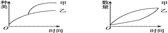 海洋中,因地震造成了大小相似的甲、乙两个小岛。一段时间后,两岛上鸟的种类和数量随时间变化的情况如下图所示。下列有关叙述中,错误的是()
