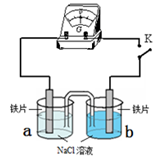 ①K3[Fe(CN)6]溶液与二价铁离子反应生成蓝色沉淀,而取a、b中溶液少量,滴加K3[Fe(CN)6]溶液,a中出现蓝色沉淀,说明a中生成二价铁离子,b中无变化,b中没有二价铁离子生成,所以a做负极,b做正极;