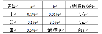 向烧杯a、b中各加入30 mL不同质量分数的NaCl溶液,实验记录如下表所示。
