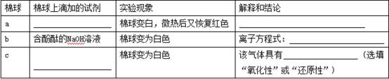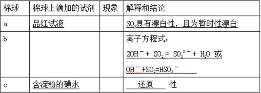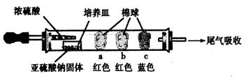 如图所示,将浓硫酸滴入装有Na2SO3固体的培养皿一段时间后,a、b、c三个棉球变化如下表。请填写表中的空白: