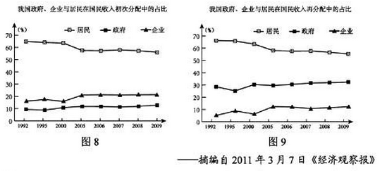 我国居民收入在国民收入初次分配、再分配中的比重分别如图8、图9所示