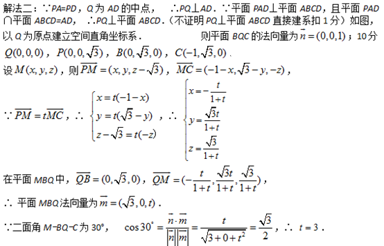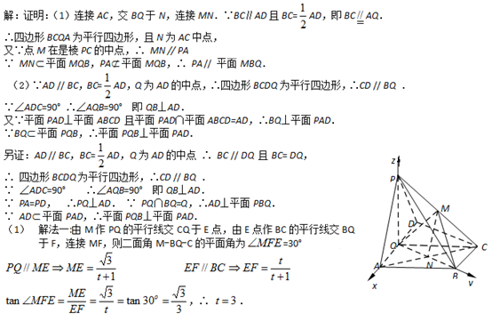 (3)若二面角M-BQ-C为30°,设PM=tMC,试确定t的值 .