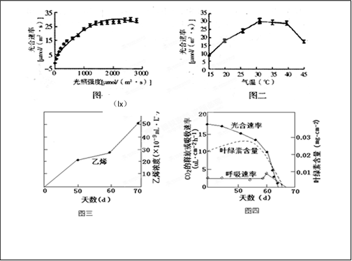 (1)当光照强度从饱和点2458(lx)到2800(lx)时,叶片光合速率仍没有明显下降,说明凤眼莲对强光环境 _________,与原产地相比较,该地区凤眼莲光合强度主要限制因素是 ______ 。据图二,凤眼莲最适光合温度范围为 _______ 。温度对光合速率影响主要表现