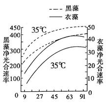 下图表示温度、光照强度对黑藻和衣藻光合作用的影响。通过比较不同条件下 两种藻类的净光合速率(单位为