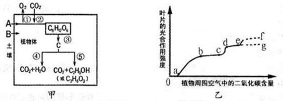 (1)甲图中A、B代表植物从土壤中吸收的两大类物质:A代表_______,B代表____。在氧气充足的条件下,物质B进入植物体的过程需要_______(填标号)过程提供ATP。