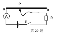 为测定某电源内阻r和一段电阻线单位长度的电阻R0,设计如图所示的电路。ab是一段粗细均匀的电阻线,R是阻值为2Ω的保护电阻,电源电动势为6v,安培表内阻不计,示数用i表示,滑动片P与电阻丝有良好接触, aP长度用L表示,其它连接导线电阻不计。