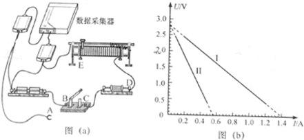 (2)实验得到的U-I关系如图(b)中的直线Ⅰ所示,则电池组的电动势为( )V,内电阻阻值为( )