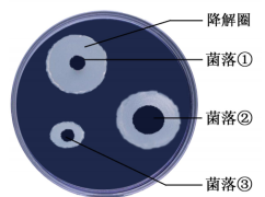 (4)刚果红可以与纤维素形成红色复合物,但并不与纤维素降解产物纤维二糖和葡萄糖发生这种反应。 研究人员在刚果红培养基平板上,筛到了几株有透明降解圈的菌落(见上图)。 图中降解圈大小与纤维素酶的____有关。 图中降解纤维素能力最强的菌株是____(填图中序号)。