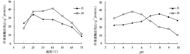 (5)J4 发酵过程会产热和产酸,J4 菌株在较高温度和酸性环境下酶的活性更高