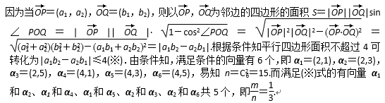 在集合{1,2,3,4,5}中任取一个偶数a和一个奇数b构成以原点为起点的向量α=(a,b),从所有得到的以原点为起点的向量中任取两个向量为邻边作平行四边形,记所有作成的平行四边形的个数为n,其中面积不超过4的平行四边形的个数为m,则