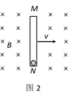 如图2所示,在垂直于纸面向里的匀强磁场中,一内壁光滑长为l的绝缘细管MN,沿纸面以速度v向右做匀速运动。在管的N端固定一个电量为q的带正电小球(可看做质点)。某时刻将小球释放,小球将会沿管运动。已知磁感应强度大小为B,小球的重力可忽略。在小球沿管从N运动到M的过程中,求小球所受各力分别对小球做的功。