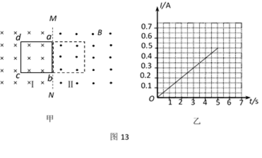 如图(甲)所示,一边长L=2.5m、质量m=0.5kg的单匝正方形金属线框,放在光滑绝缘的水平面上,垂直于水平面的方向上存在着以MN为边界、方向相反的匀强磁场,磁感应强度均为B=0.4T。正方形金属线框的一边ab与MN重合(位置Ⅰ),在力F作用下由静止开始向右平动,经过5s线框刚好被完全拉入另一磁场(位置Ⅱ)。测得金属线框中的电流随时间变化的图象如图(乙)所示,是一条过原点的直线。在金属线框由位置Ⅰ到位置Ⅱ的过程中,