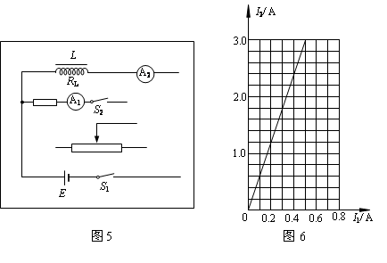 要求实验时,改变滑动变阻器的阻值,在尽可能大的范围内测得多组A1表 和A2表的读数I1、I2,然后利用给出的I2—I1图象(如图6所示),求出线圈的电阻RL。