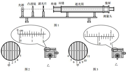 ① 已知测量头主尺的最小刻度是毫米,副尺上有 50 分度。某同学调整手轮后,从测量头 的目镜看去,像屏上出现的干涉条纹如图 2 甲所示,图 2 甲中的数字是该同学给各暗纹 的编号,此时图 2 乙中游标尺上的读数