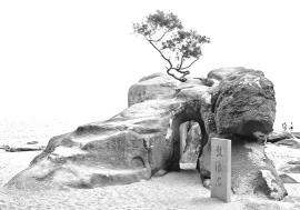 15.下图是鼓浪屿西南沙滩上屹立着的一块巨岩,中间有一个大岩洞,潮涨潮落,海浪拍打这个岩洞时,发出咚咚声响,俨如击鼓,人们称它为“鼓浪石”。