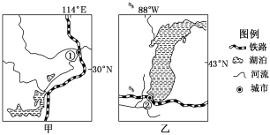 甲为长江中下游平原地区,乙为北美五大湖地区,根据所学知识可知,两地冬季容易受到北方冷空气,容易出现低温冻害现象,寒潮是冬季影响两地的主要灾害性天气,B正确。