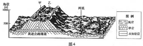 9.图4是某区域地质地貌剖面图。读图4,图中甲地多见石芽、溶洞等地形,推断未知岩层应为( )